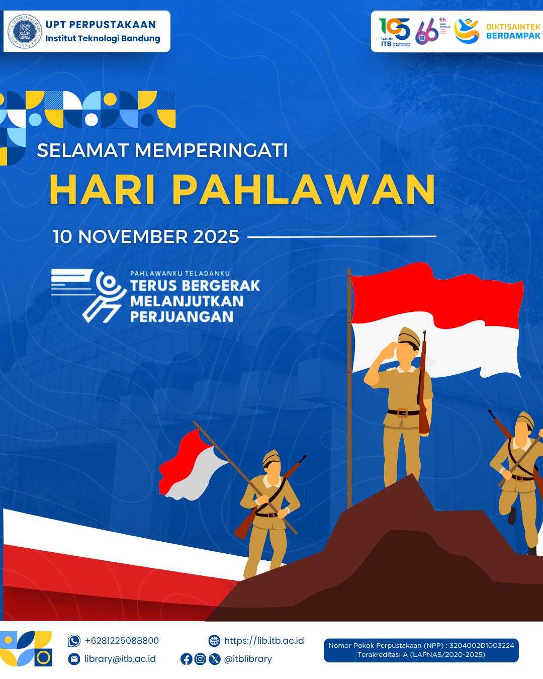 Dengan semangat “Terus Bergerak Melanjutkan Perjuangan,” UPT Perpustakaan ITB mengajak seluruh sivitas akademika untuk terus belajar, berinovasi, dan menebarkan semangat kepahlawanan dalam setiap langkah kehidupan.