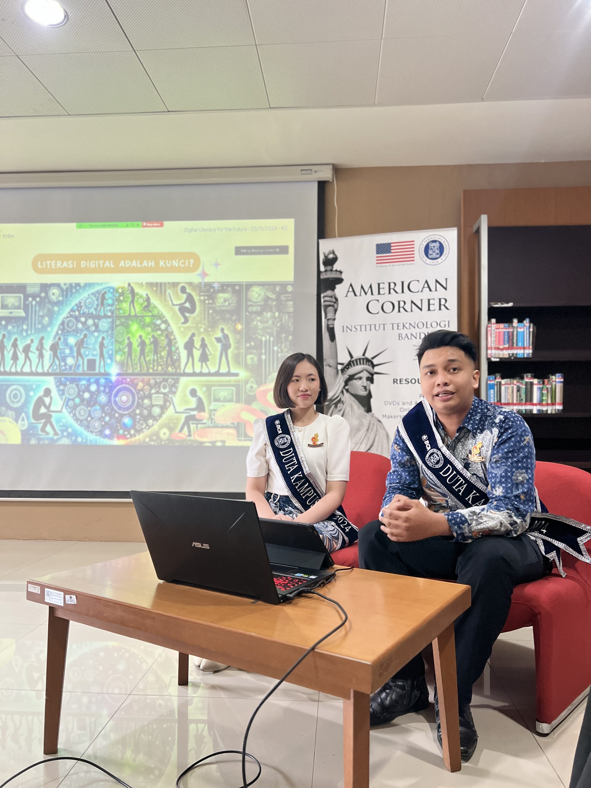 Bandung, lib.itb.ac.id – American Corner ITB telah sukses menyelenggarakan acara hybrid bertajuk “Digital Literacy for the Future” pada hari Senin, 25 November 2024, pukul 13.30–15.00 WIB. Acara ini menghadirkan dua narasumber inspiratif, Agung Imansyah dan Evelyn Yosiana, yang merupakan Duta Literasi ITB 2024 bersama BCA.