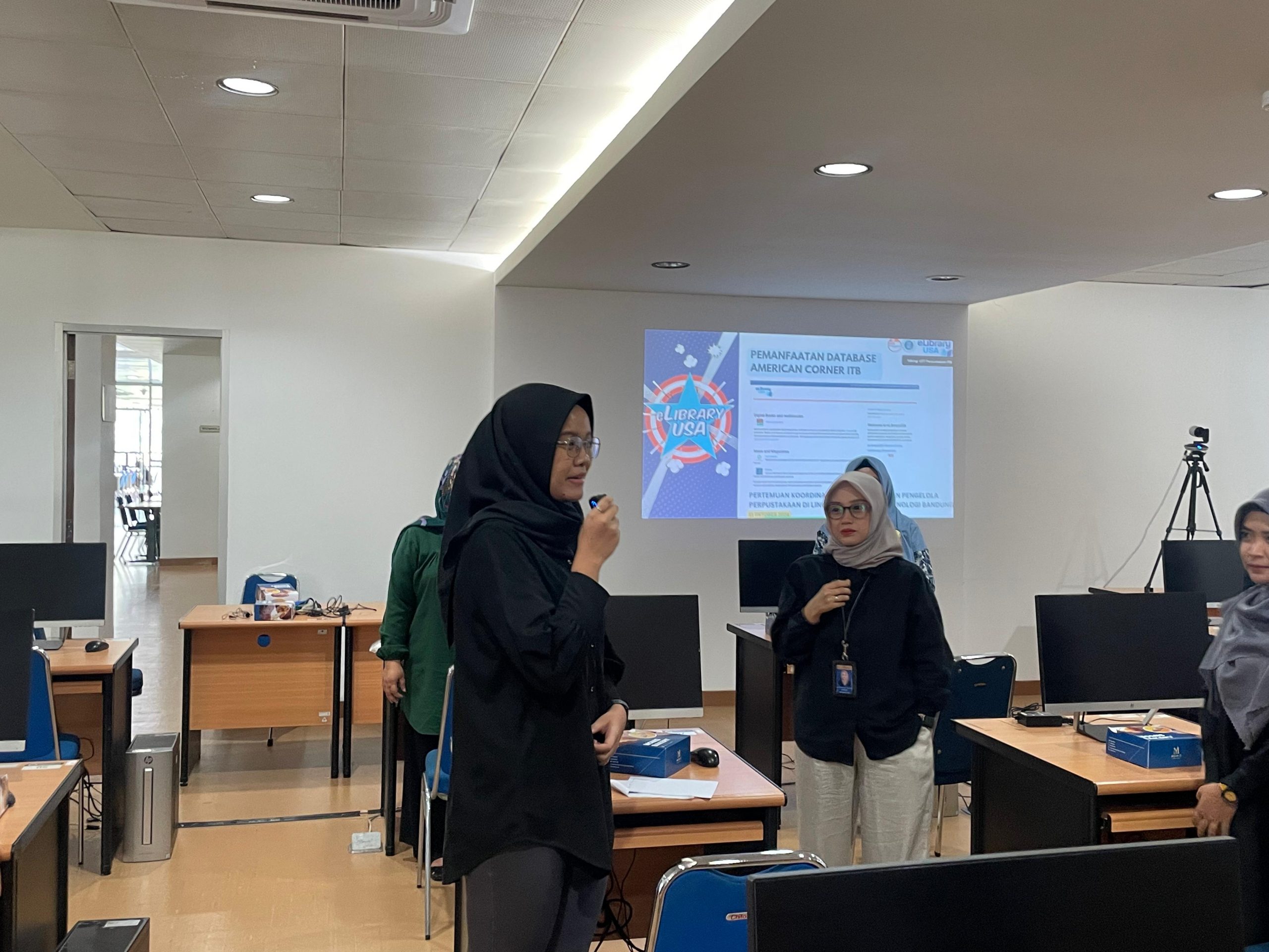 Pada sesi kedua, Dwina F. Shidiq, M.IKom, memaparkan materi berjudul “Pemanfaatan Database American Corner ITB: E-LibraryUSA”. Dalam sesi ini, narasumber memperkenalkan lebih dalam tentang American Spaces yang dikelola oleh American Corner ITB, termasuk akses ke E-LibraryUSA, sebuah sumber daya digital yang memberikan akses ke koleksi informasi berkualitas dari berbagai disiplin ilmu. Para peserta pertemuan juga diberikan pelatihan online untuk mendapatkan akun E-LibraryUSA sehingga dapat memanfaatkan sumber daya ini secara optimal. Narasumber menekankan pentingnya memanfaatkan koleksi digital dalam mendukung proses belajar dan penelitian di ITB.
