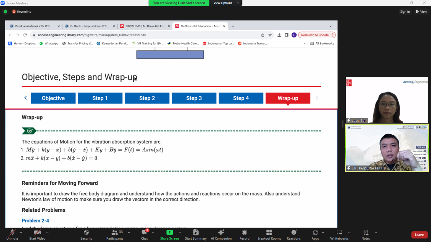 Bandung, lib.itb.ac.id. Pada tahun 2024 ini UPT Perpustakaan melanggan basis data e-book McGrawHill Access Engineering, McGrawHill Access Engineering merupakan referensi teknik yang memberikan konten teknik interdisipliner yang terintegrasi dengan alat pengajaran dan pembelajaran analitik. Untuk memaksimalkan pemanfaatan dari basis data e-book McGrawHill Access Engineering, UPT Perpustakaan akan mengadakan kegiatan sosialisasi akses basis data e-book McGrawHill Access Engineering secara online melalui Zoom, pada Hari Jumat tanggal 22 Maret 2024 pukul 09.00 s.d. 10.30 WIB. Kegiatan sosialisasi menghadirkan narasumber Sari Lusia (Sales Manager Indonesia McGraw Hill Professional) dengan moderator Ririk Sundari, M.A.P (Koordinator Layanan Rujukan dan Pemanduan, UPT Perpustakaan).