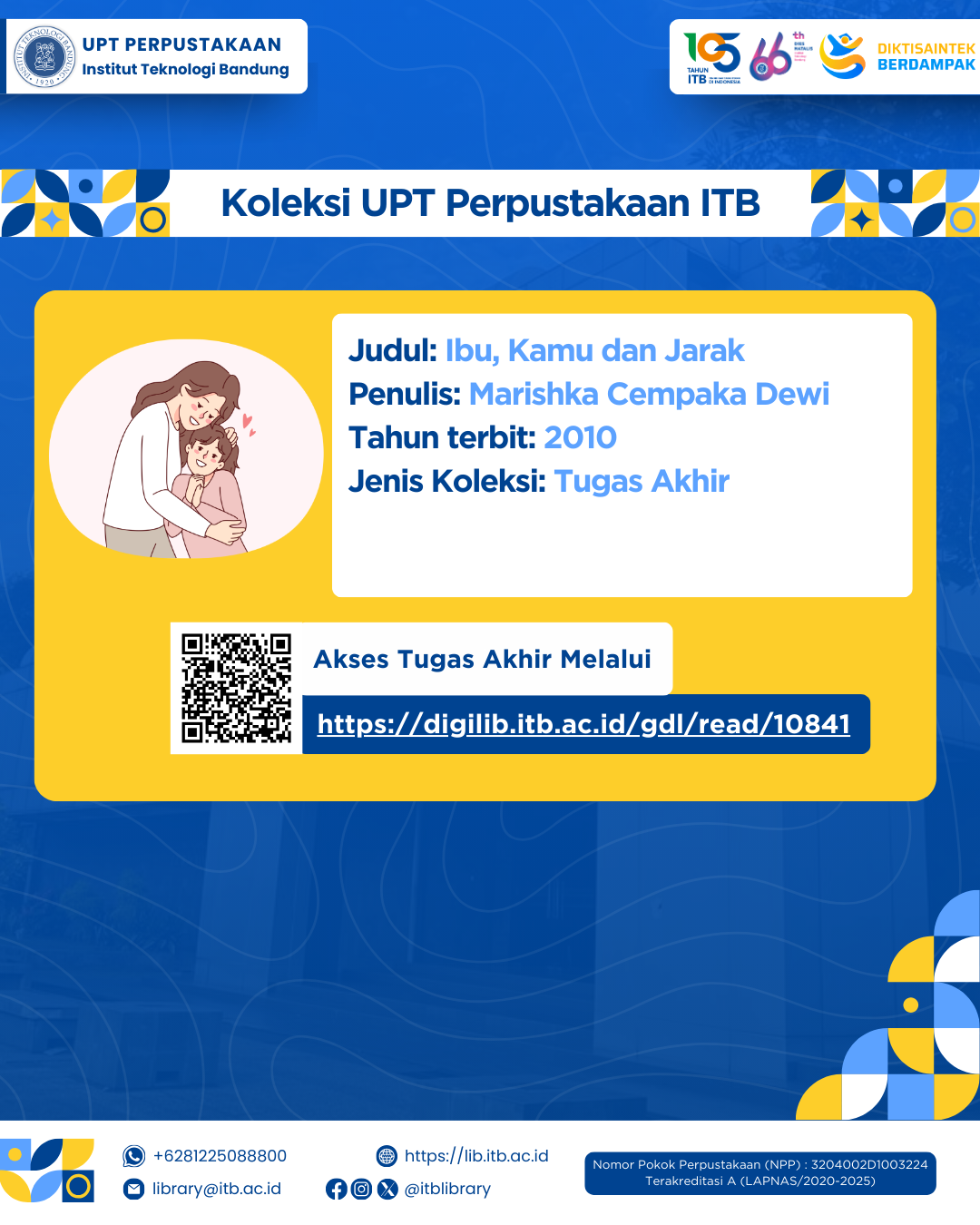 Sebagai bagian dari peringatan Hari Ibu, UPT Perpustakaan ITB menyoroti salah satu koleksi Tugas Akhir berjudul “Ibu, Kamu dan Jarak” karya Marishka Cempaka Dewi (2010). Karya ini mengangkat relasi emosional antara ibu dan anak, serta dinamika jarak yang tidak pernah mampu menghapus ikatan batin di antara keduanya.