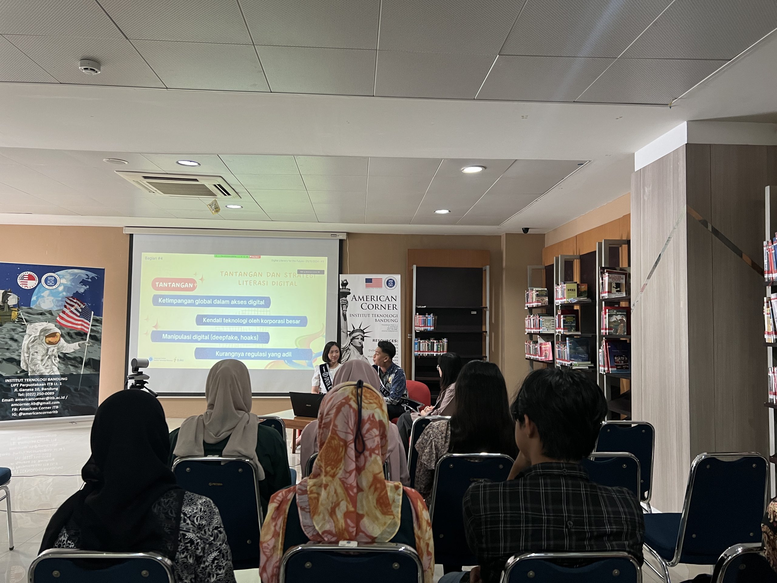 Bandung, lib.itb.ac.id – American Corner ITB telah sukses menyelenggarakan acara hybrid bertajuk “Digital Literacy for the Future” pada hari Senin, 25 November 2024, pukul 13.30–15.00 WIB. Acara ini menghadirkan dua narasumber inspiratif, Agung Imansyah dan Evelyn Yosiana, yang merupakan Duta Literasi ITB 2024 bersama BCA.