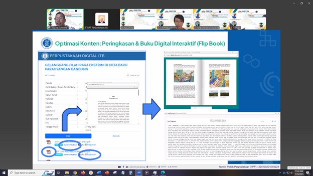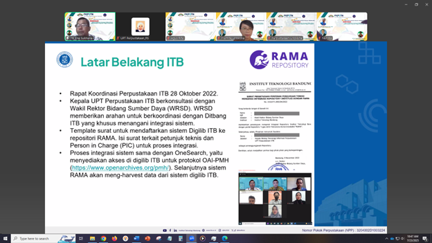 Dalam kesempatan itu Kepala UPT Perpustakaan memaparkan strategi Integrasi Digilib ke Rama Repository dengan paparan berjudul “Perpustakaan Digital Institut Teknologi Bandung”. Dalam paparannya, ia menjelaskan bahwa latar belakang Digilib ITB mulai terintegrasi dengan Rama Repository merupakan respons atas inisiatif Kemendikbudristek dalam membangun repositori nasional untuk menghimpun karya ilmiah dari seluruh perguruan tinggi di Indonesia. Di satu sisi pada saat itu Digilib ITB belum terintegrasi dengan RAMA, sementara integrasi penting agar data bimbingan tugas akhir dapat digunakan sebagai bukti dalam proses kenaikan jabatan akademik para dosen. Kemudian setelah berkoordinasi dengan Ditbang ITB, UPT perpustakaan memulai proses pengintegrasian Digilib ke Rama Repository.