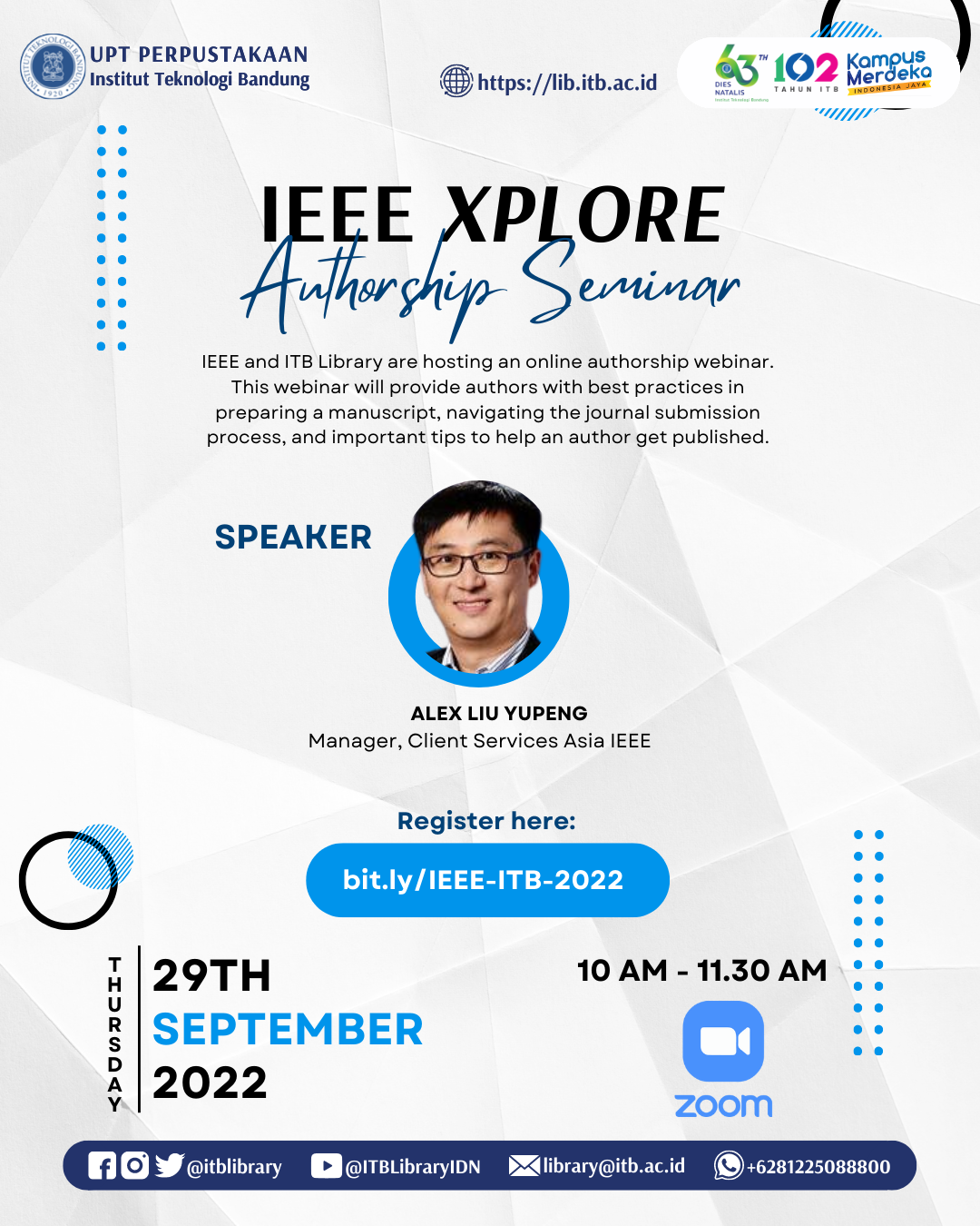 IEEE and ITB Library are hosting an online authorship webinar. This webinar will provide authors with best practices in preparing a manuscript, navigating the journal submission process, and important tips to help an author get published. The event will be held on Thursday, 29th September 2022, from 10 am to 11.30 am. The speaker is Alex Liu Yupeng, Manager, Client Services Asia. IEEE. All academic member of ITB can join this event by register at bit.ly/IEEE-ITB-2022.