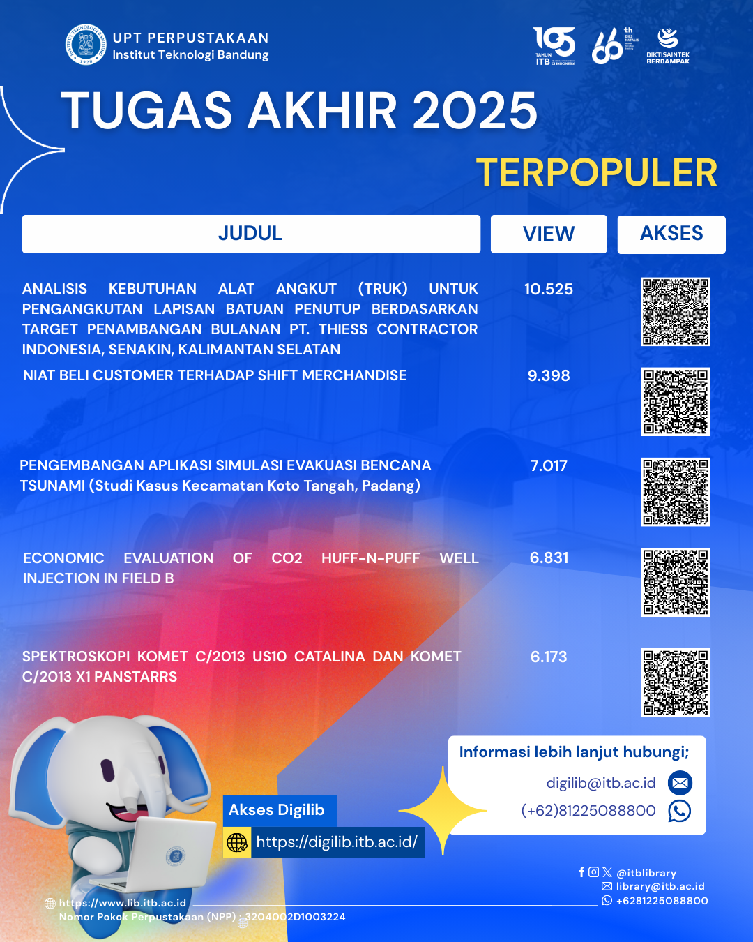 UPT Perpustakaan Institut Teknologi Bandung merilis daftar Karya Ilmiah Terpopuler 2025, yang mencakup koleksi Tugas Akhir, Tesis, dan Disertasi dengan jumlah akses tertinggi berdasarkan data statistik pemanfaatan Digital Library ITB sepanjang tahun 2025.