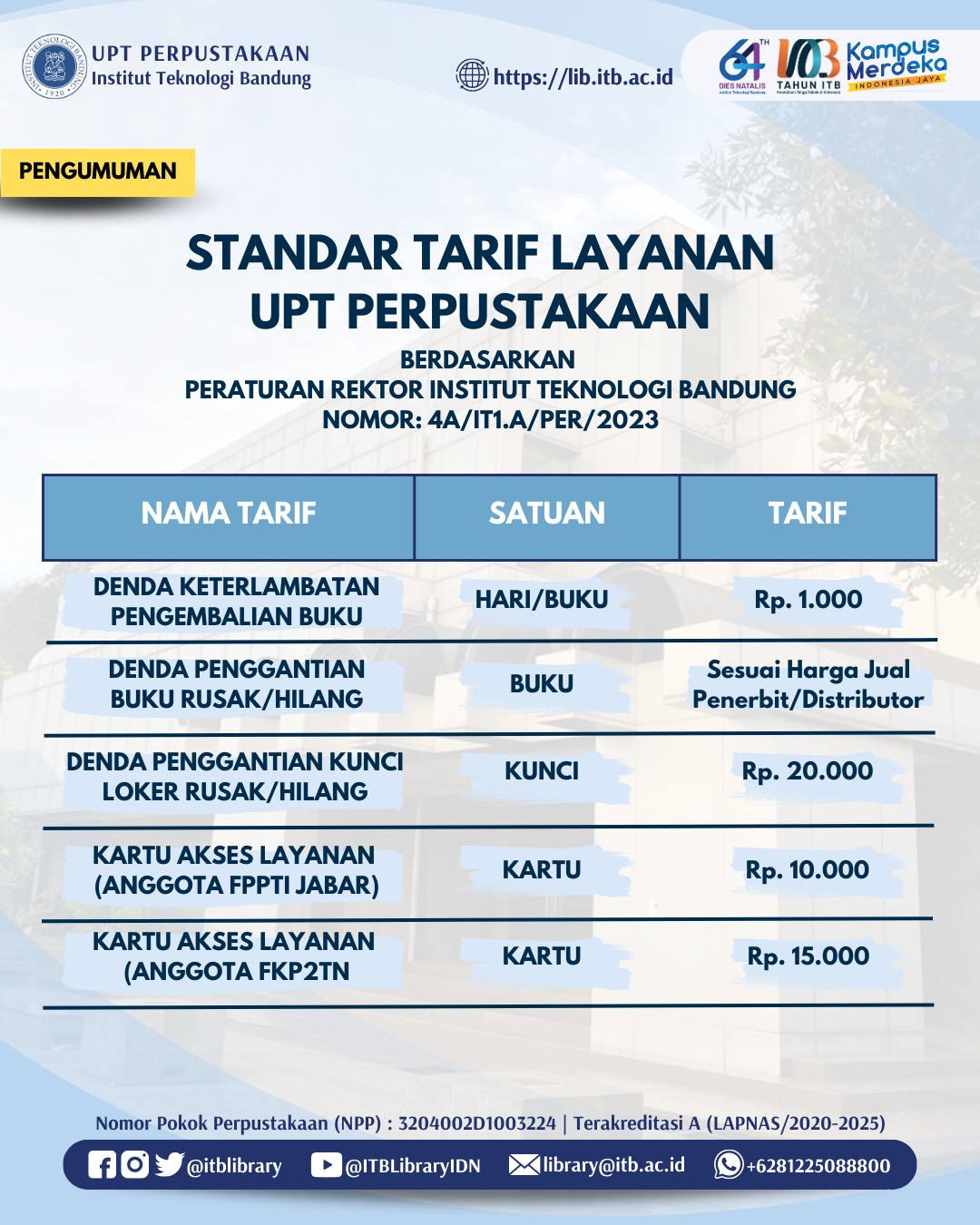 Berdasarkan Peraturan Rektor Institut Teknologi Bandung Nomor:4A/IT1.A/PER/2023 mengenai STANDAR TARIF LAYANAN LABORATORIUM DAN LAYANAN PENDUKUNG INSTITUT TEKNOLOGI BANDUNG, berikut merupakan Informasi Standar Tarif Layanan di UPT Perpustakaan;