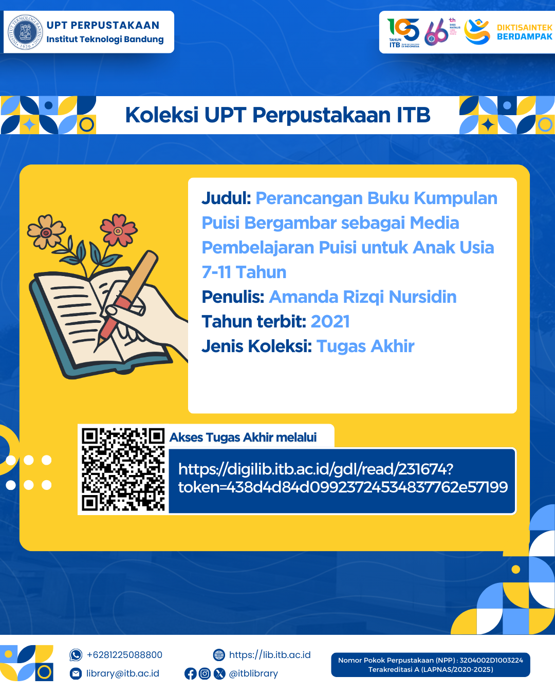 UPT Perpustakaan ITB menyediakan berbagai koleksi tugas akhir yang dapat dimanfaatkan sebagai sumber referensi akademik. Salah satu koleksi tersebut adalah karya berjudul “Perancangan Buku Kumpulan Puisi Bergambar sebagai Media Pembelajaran Puisi untuk Anak Usia 7–11 Tahun” karya Amanda Rizqi Nursidin (2021).