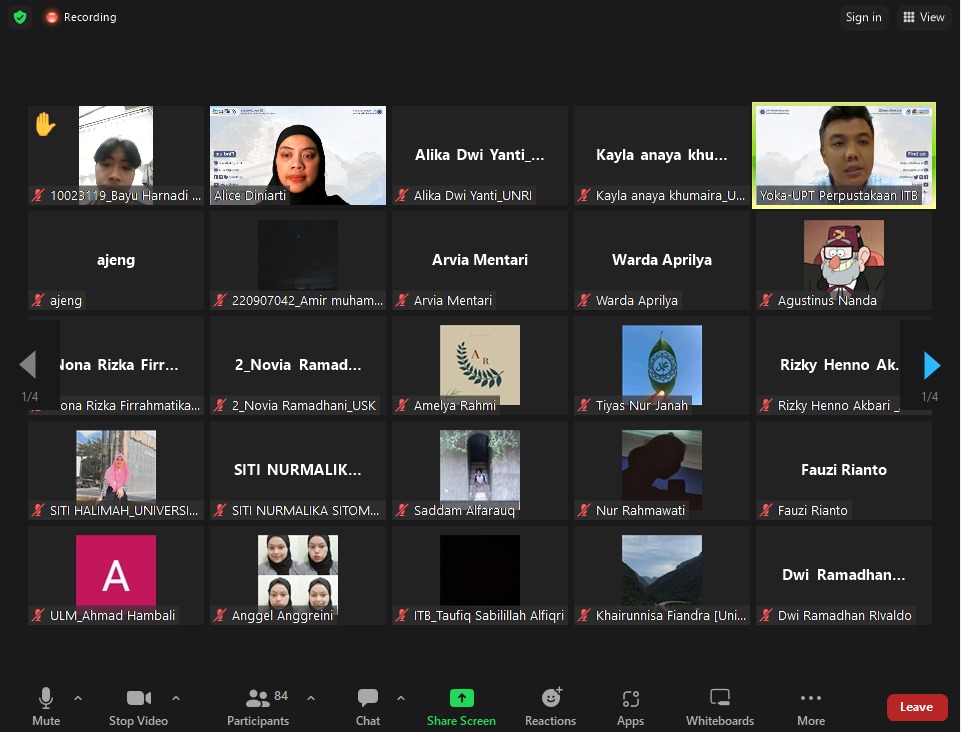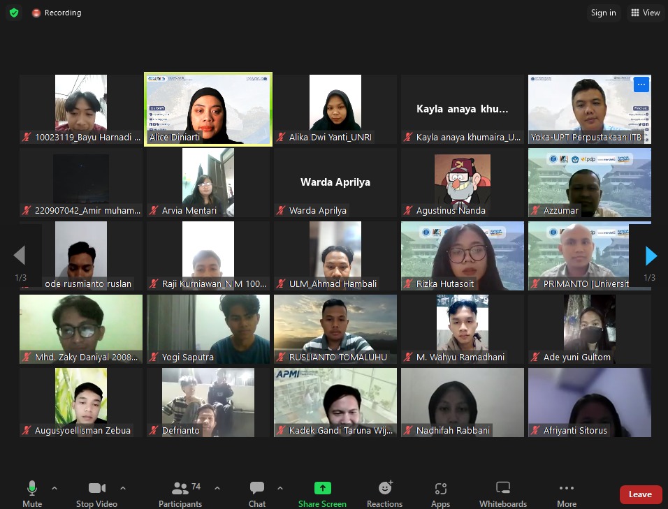 Bandung – lib.itb.ac.id. Pada Hari Senin, tanggal 4 September 2023 pukul 18.30 s.d. 19.30 WIB UPT Perpustakaan melaksanakan orientasi perpustakaan untuk mahasiswa Program Pertukaran Mahasiswa Merdeka 2023 (PMM 3 ITB) melalui platform Zoom Webinar. Kegiatan tersebut dihadiri oleh 80 mahsiswa dengan materinya mengenai layanan dan fasilitas yang ada di UPT Perpustakaan ITB, diantaranya yaitu akses buku cetak, akses digilib, repositori yang meliputi Tugas Akhir, Tesis dan Disertasi, kemudian ada materi mengenai Akses E-book dan akses E-Journal. Kegiatan orientasi Perpustakaan mahasiswa baru ITB yang utamanya dihadiri oleh Yoka Adam Nugrahaa, S.Sos, selaku Kepala Bidang Layanan Pemustaka dan Literasi Ilmiah dan Alice Diniarti, M.I.Kom. selaku Koordinator Layanan Repositori, Konten Digital dan Multimedia.