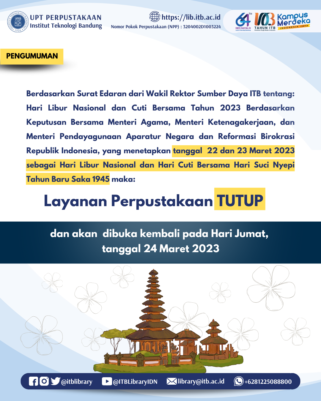 Berdasarkan Surat Edaran dari Wakil Rektor Sumber Daya ITB tentang: Hari Libur Nasional dan Cuti Bersama Tahun 2023 Berdasarkan Keputusan Bersama Menteri Agama, Menteri Ketenagakerjaan, dan Menteri Pendayagunaan Aparatur Negara dan Reformasi Birokrasi Republik Indonesia, yang menetapkan tanggal 22 dan 23 Maret 2023 sebagai Hari Libur Nasional dan Hari Cuti Bersama Hari Suci Nyepi Tahun Baru Saka 1945 maka Layanan Perpustakaan TUTUP dan akan dibuka lagi pada Hari Jumat, tanggal 24 Maret 2023.
