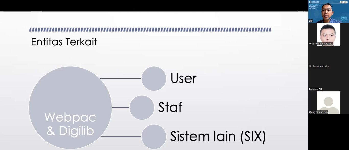 Dalam kegiatan yang dilaksanakan secara daring melalui aplikasi zoom pada hari Rabu (23/02/2022) menghadirkan 4 (empat) narasumber dari UPT Perpustakaan dengan moderator Siti Sarah Nurbaity, S.Sos. Narasumber yang pertama adalah Esha Mustika Dewi, S.Sos (Koordinator Layanan Pengembangan Koleksi Cetak) dengan materi Mekanisme pengusulan buku cetak. Nara sumber kedua adalah Iin Supriatin, S.Sos (Koordinator Layanan Sirkulasi) menyampaikan materi Peminjaman koleksi cetak secara daring. Sesi selanjutnya adalah penyampaian materi akses Koleksi E-Resources (E-Journal dan E-Book) dengan narasumber Yoka Adam Nugrahaa, S.Sos (Kepala Bidang Layanan Pemustaka dan Literasi Ilmiah), dan narasumber terakhir adalah M. Arif Trikanda, S.Si (Kepala Bidang Teknologi Informasi Perpustakaan), dengan materi Pemanfaatan perpustakaan digital (digilib) dan sistem informasi perpustakaan (webpac).