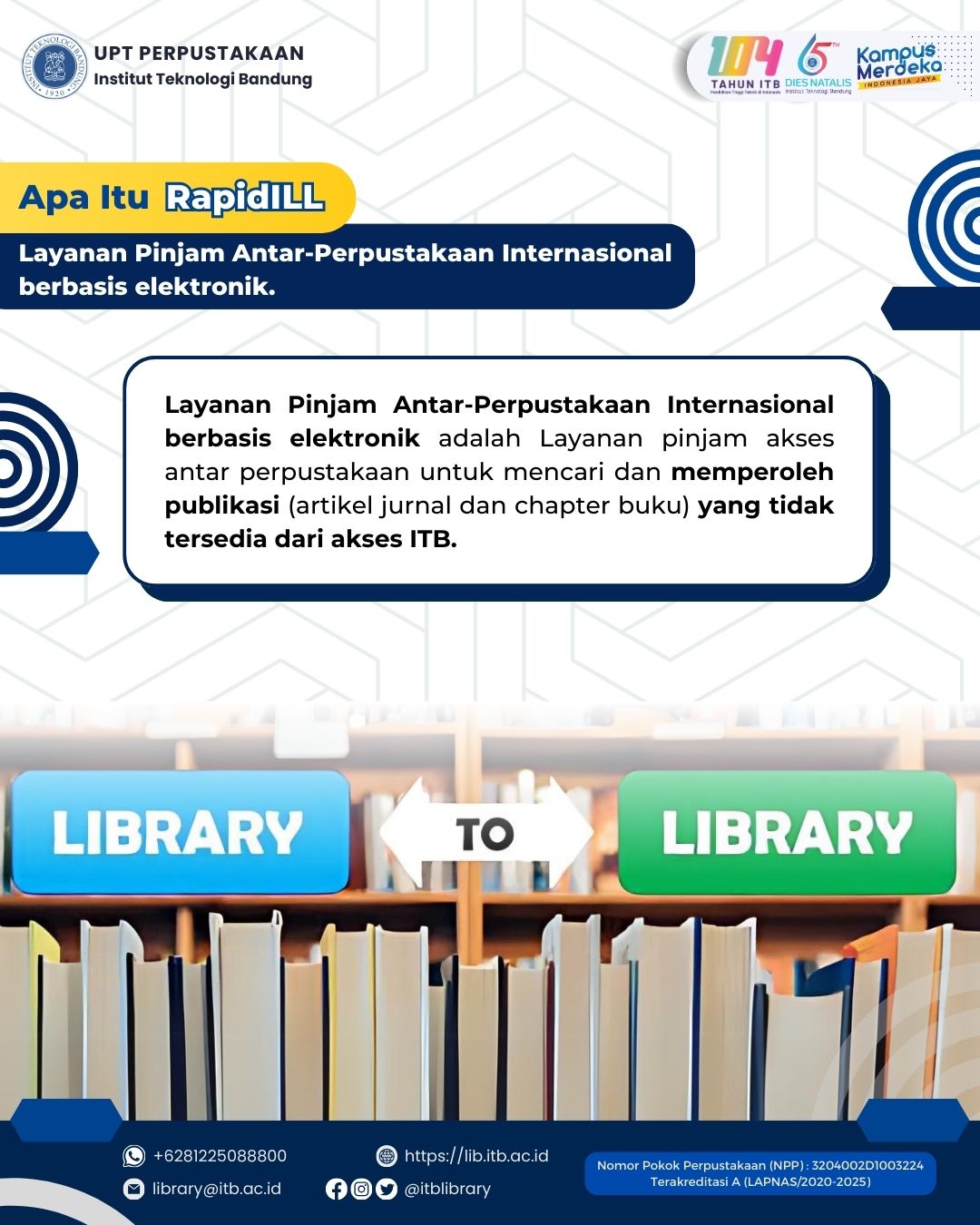 Perpustakaan ITB menyediakan layanan pinjam antar-perpustakaan internasional berbasis elektronik untuk memenuhi kebutuhan akan informasi ilmiah yang lebih luas. Layanan ini memungkinkan civitas akademika ITB untuk memperoleh akses ke publikasi ilmiah (artikel jurnal dan bab buku) yang tidak tersedia di koleksi perpustakaan ITB. Permintaan dokumen akan diproses sesuai dengan prosedur yang berlaku dan hasil pemrosesan akan diinformasikan melalui email institusi.