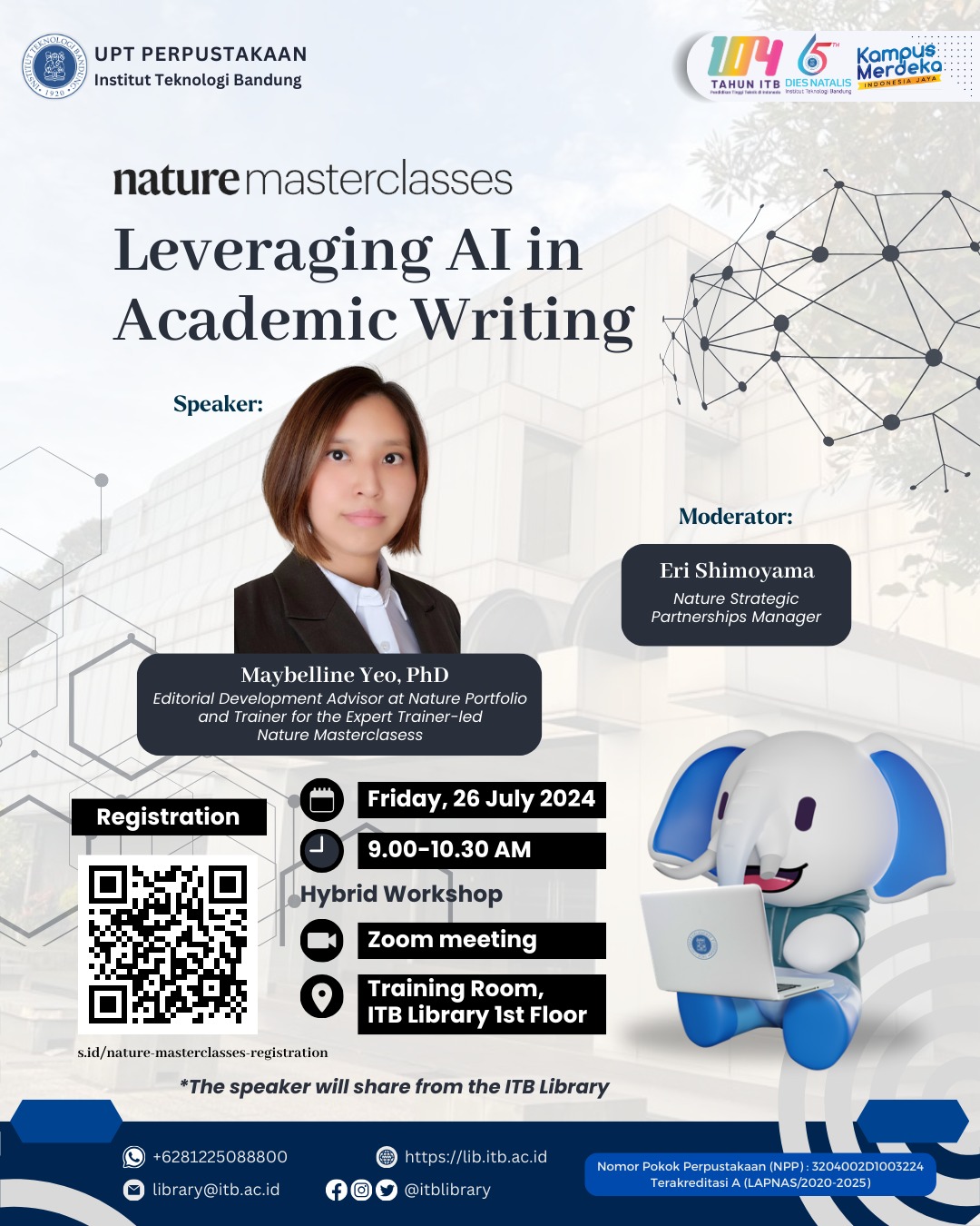 UPT Perpustakaan Institut Teknologi Bandung (ITB) bekerjasama dengan Penerbit Nature (https://www.nature.com/) akan mengadakan kegiatan Nature Masterclasses, ”Getting Published Workshop: Leveraging AI in Academic Writing”. Lokakarya ini dirancang untuk memberikan pemahaman yang komprehensif kepada sivitas akademika ITB khususnya para peneliti tentang AI dan aplikasinya dalam penulisan akademik. Peserta akan mempelajari tantangan terkait dengan pemanfaatan AI, mengeksplorasi pertimbangan etis dan kebijakan editorial, serta memperoleh keterampilan praktis dalam rekayasa prompt yang efektif. Kegiatan akan dilaksanakan pada: