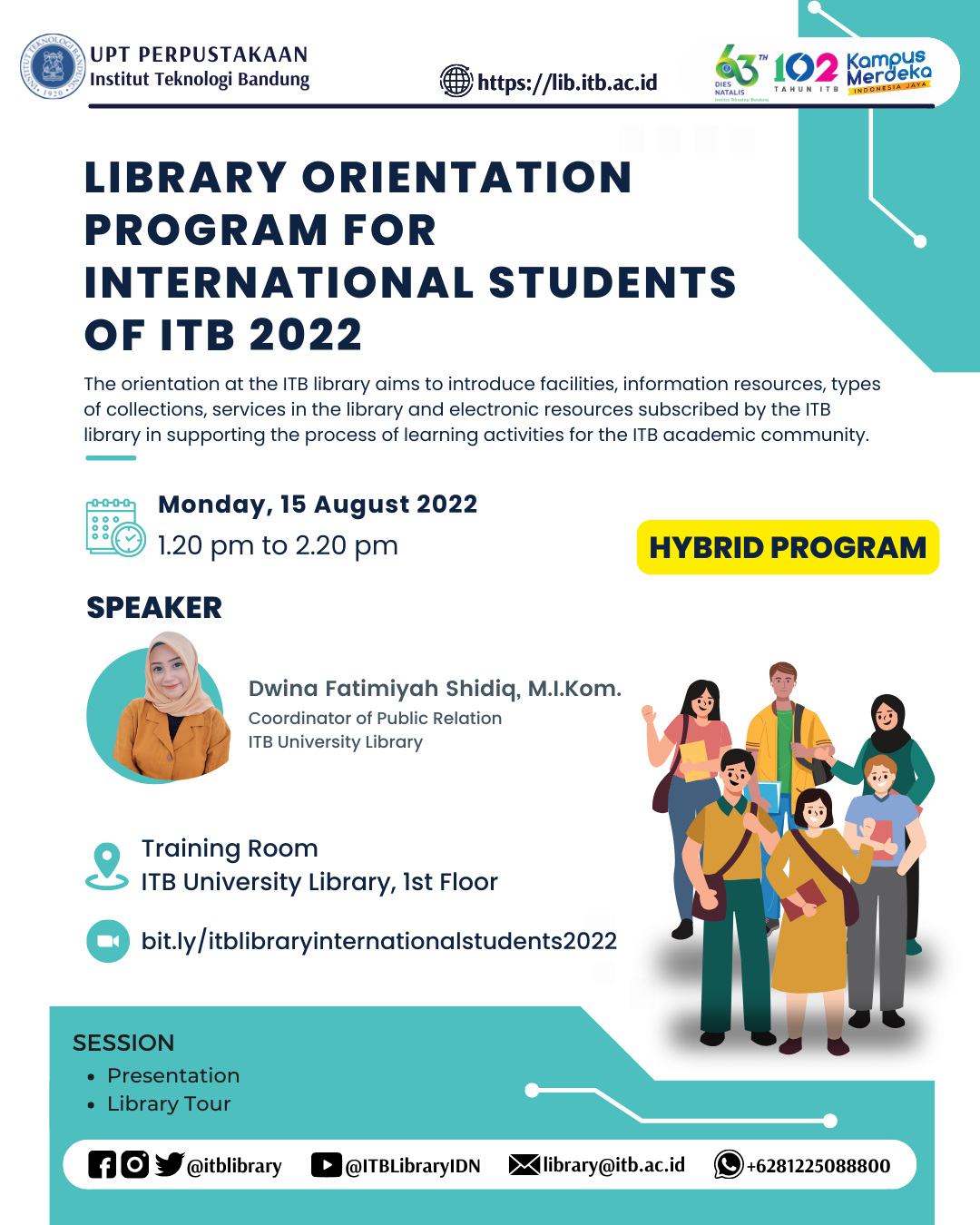 UPT Perpustakaan ITB akan melaksanakan kegiatan Orientasi Perpustakaan Mahasiswa Baru Internasional ITB 2022 yang merupakan rangkaian dari penyambutan mahasiswa baru ITB 2022. Kegiatan tersebut akan dilaksanakan secara hybrid, luring dan daring pada Hari Senin, 15 Agustus 2022 pukul 13.20 s.d. 14.20 WIB. Pembicara pada kegiatan orientasi tahun ini adalah Dwina Fatimiyah Shidiq, M.I.Kom. (Koordinator Layanan Humas UPT Perpustakaan ITB).