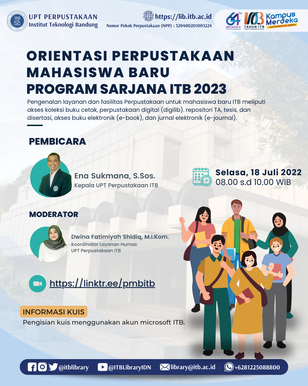 UPT Perpustakaan akan melaksanakan kegiatan orientasi perpustakaan untuk mahasiswa baru ITB Semester I tahun 2023/2024. Orientasi perpustakaan tersebut merupakan pengenalan layanan dan fasilitas Perpustakaan untuk mahasiswa baru ITB meliputi akses koleksi buku cetak, perpustakaan digital (digilib). repositori TA, tesis, dan disertasi, akses buku elektronik (e-book), dan jurnal elektronik (e-journal).Kegiatan tersebut akan dilaksanakan secara daring melalui platform Zoom pada Hari Selasa, tanggal 18 Juli 2023 pukul 08.00 s.d. 10.00 WIB dengan pembicaranya yaitu Kepala UPT Perpustakaan, Ena Sukmana, S.Sos.