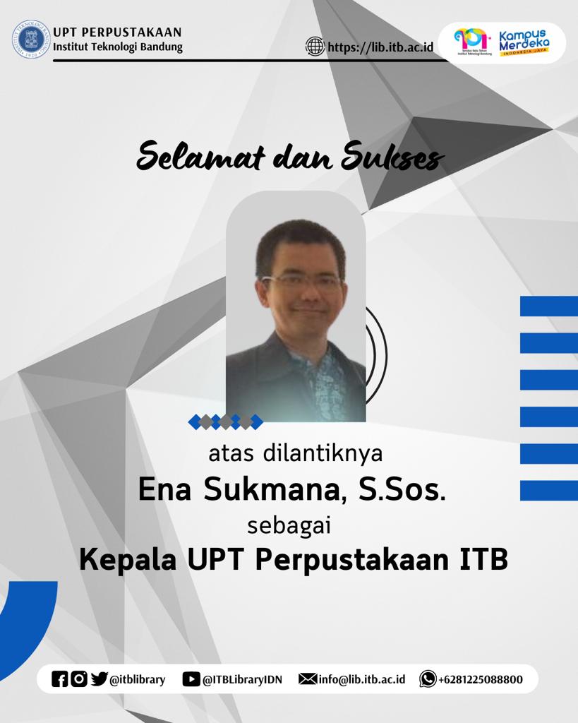Berdasarkan Surat Keputusan Rektor tanggal 4 Februari 2022 tentang Pemberhentian dan Pengangkatan Pejabat Institut Teknologi Bandung, Rektor ITB memberhentikan dengan hormat Pejabat yang nama-namanya sebagaimana tercantum pada Lampiran I keputusannya, dengan ucapan terima kasih atas jasa dan pengabdian yang telah diberikan selama memangku jabatan tersebut, dan mengangkat nama-nama sebagaimana tercantum pada lampiran II keputusannya dalam jabatan sebagaimana disebut dalam surat. Salah satu pejabat yang diangkat dan telah dilantik pada tanggal 17 Februari 2022 adalah Ena Sukmana, S.Sos., yang diangkat sebagai pejabat Kepala UPT Perpustakaan Institut Teknologi Bandung.