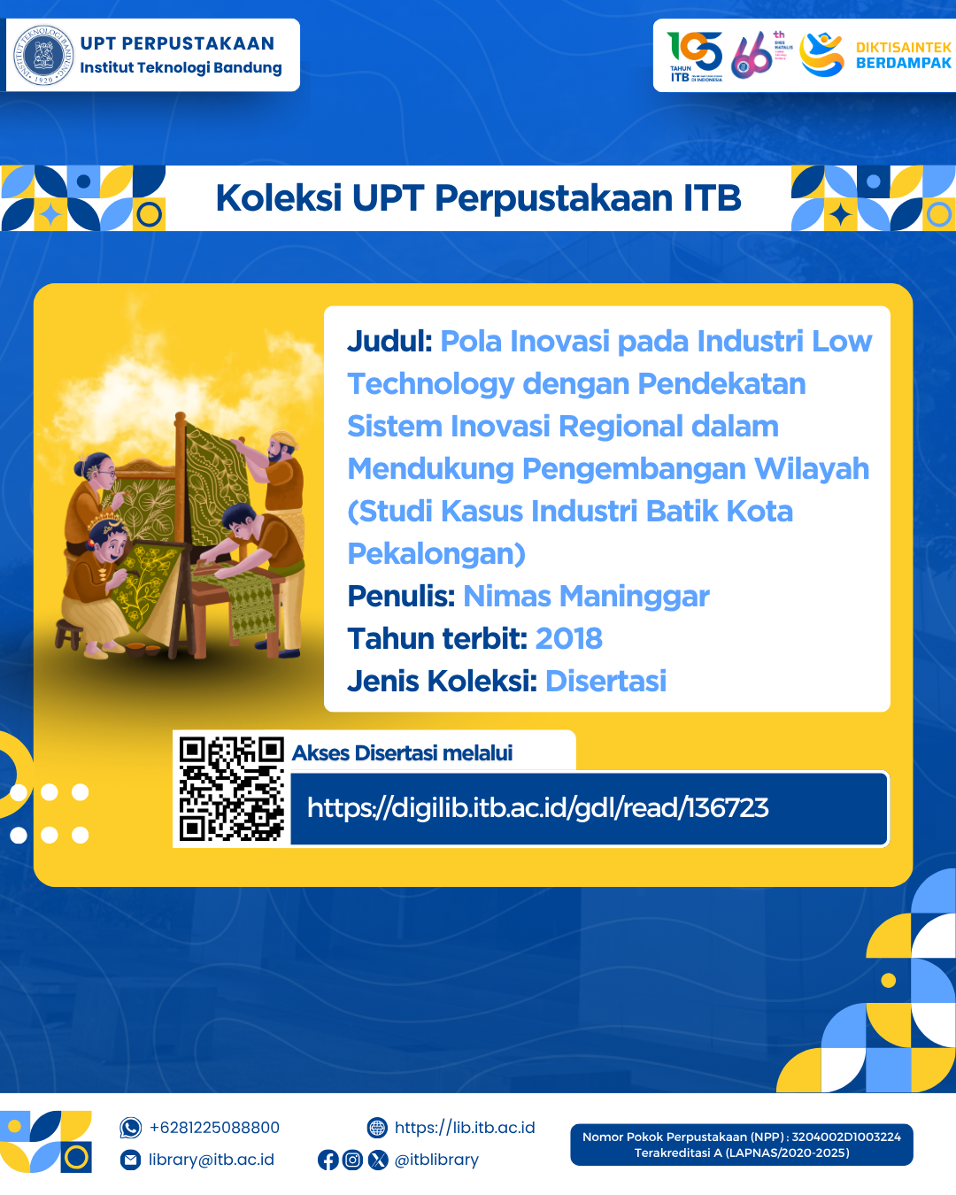 Karya ini menyoroti pentingnya inovasi di industri batik sebagai bagian dari pengembangan wilayah dan penguatan ekonomi kreatif lokal. Koleksi dapat diakses secara daring melalui Digilib ITB di tautan: https://digilib.itb.ac.id/gdl/read/136723.